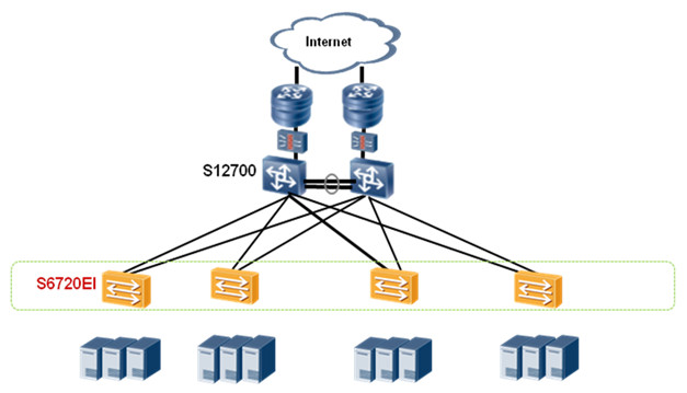 如下(xià)圖,采用(yòng)S12700系列敏捷交換機作爲數據中心核心,通(tōng)過集成的(de)防火牆、負載均衡等多(duō)業務闆卡來(lái)實現安全保證和(hé)流量均衡。萬兆服務器接入可(kě)使用(yòng)S6720-EI提供高(gāo)密度的(de)萬兆接入方案。