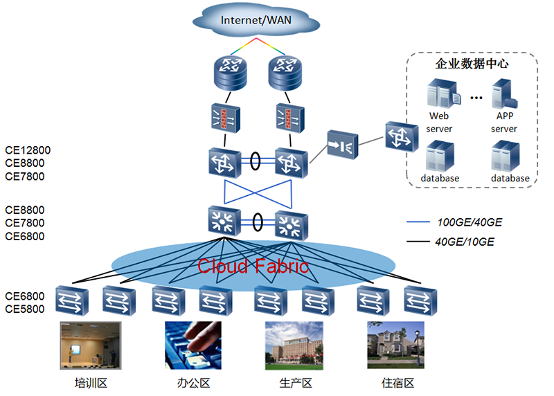 在園區(qū)網的(de)典型組網中,采用(yòng)多(duō)台CE12800/CE8800/CE7800使用(yòng)CSS/iStack技術虛拟爲一台核心交換機,在彙聚層使用(yòng)多(duō)台CE8800/CE7800/CE6800使用(yòng)iStack技術堆疊爲一台邏輯交換機,增加網絡可(kě)靠性的(de)同時(shí)簡化(huà)管理(lǐ)。在接入層,使用(yòng)經SVF、M-LAG等Cloud Fabric技術縱向虛拟化(huà)後的(de)CE6800/CE5800,提供高(gāo)密度的(de)線速端口。