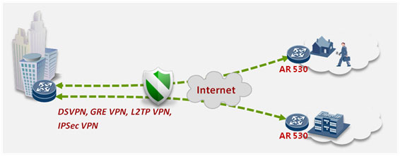 AR530支持多(duō)種安全接入功能,滿足終端與主站之間數據傳輸的(de)安全需求。主站和(hé)工業路由器之間建立包括GRE VPN、IPSEC VPN、DSVPN、L2TP VPN等安全隧道,用(yòng)于終端和(hé)前置機之間的(de)通(tōng)信,實現數據的(de)安全訪問與傳輸。