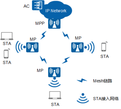 在上述組網中,作爲Mesh節點MP(mesh point)的(de)AP通(tōng)過網狀互聯形成自配置、自愈合的(de)無線Mesh網絡WMN(wireless mesh network)主幹,通(tōng)過作爲Mesh Portal節點MPP(mesh portal point)的(de)帶網關功能的(de)AP提供到Internet的(de)連接。終端節點可(kě)以通(tōng)過AP的(de)接入服務來(lái)接入WMN網絡中。由于存在專用(yòng)的(de)Mesh路由協議(yì),其傳輸質量能夠得(de)到較好的(de)保障,更适用(yòng)于需要高(gāo)帶寬、高(gāo)穩定性的(de)Internet連接的(de)場(chǎng)景。
