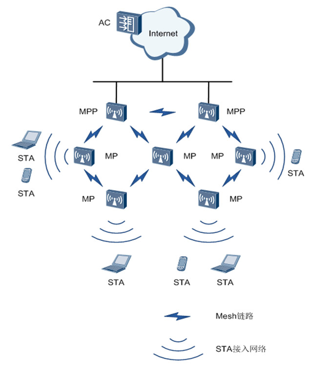 在上述組網中,作爲Mesh節點MP(Mesh Point)的(de)AP通(tōng)過網狀互聯形成自配置、自愈合的(de)無線Mesh網絡WMN(wireless mesh network)主幹,通(tōng)過作爲Mesh Portal節點MPP(Mesh Portal Point)的(de)帶網關功能的(de)AP提供到Internet的(de)連接。終端節點可(kě)以通(tōng)過AP的(de)接入服務來(lái)接入WMN網絡中。由于存在專用(yòng)的(de)Mesh路由協議(yì),其傳輸質量能夠得(de)到較好的(de)保障,更适用(yòng)于需要高(gāo)帶寬、高(gāo)穩定性的(de)Internet連接的(de)場(chǎng)景。