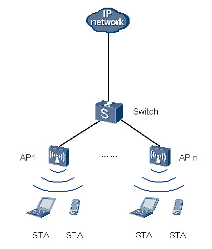 在上述組網中,設備作爲Fit AP隻承載橋接轉發功能,用(yòng)戶接入、AP上線、認證、路由、AP管理(lǐ)、安全協議(yì)、QoS等功能需要同AC配合完成。