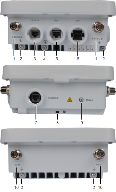 1.2.4G/5G:連接2.4GHz或5GHz天線,用(yòng)于發送和(hé)接收無線信号。接口類型爲N型母頭(N-Type Female)。