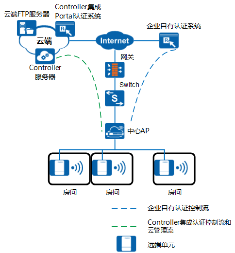 在上述組網中,中心AP設備作爲雲AP,用(yòng)戶接入、AP上線、認證、路由、AP管理(lǐ)、安全協議(yì)、QoS等功能需要同雲端的(de)雲管理(lǐ)平台配合完成。客戶可(kě)以使用(yòng)雲管理(lǐ)平台中集成的(de)Portal認證服務器,也(yě)可(kě)以使用(yòng)企業自己部署的(de)認證服務器。