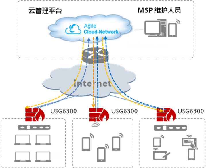 雲管理(lǐ)平台部署于華爲公有雲或MSP公有雲,爲用(yòng)戶提供防火牆維護管理(lǐ)界面。防火牆位于SMB、分(fēn)支、園區(qū)出口,爲用(yòng)戶提供有線無線上網服務。用(yòng)戶僅需購(gòu)買防火牆及雲管理(lǐ)License即可(kě)通(tōng)過雲管理(lǐ)平台實現全網設備的(de)規劃和(hé)維護管理(lǐ)。對(duì)于用(yòng)戶并發接入數不高(gāo)、站點分(fēn)布較分(fēn)散,不具備網絡專業技術能力的(de)中小企業,雲管理(lǐ)網絡解決方案具有明(míng)顯的(de)優勢。